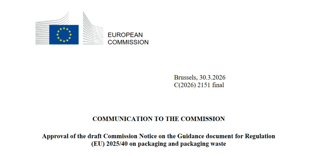 2026年3月30日,欧盟发布《包装和包装废弃物法规》(PPWR, (EU) 2025/40)的指南草案及常见问题解答。该指南草案重点解读了有害物质管控、可回收性实施、统一标签等核心要求,进一步明确法规自2026年8月12日正式实施后的执行标准。